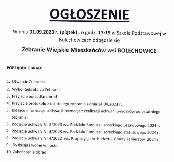 01 września 2023 roku w Szkole Podstawowej w Bolechowicach o godz. 17.15 odbędzie się Zebranie Wiejskie Mieszkańców wsi Bolechowice. W załącznikach porządek obrad oraz propozycje do budżetu. Załączniki do pobrania Porządek obrad (181 kB)Propozycje do budżetu (24 kB)Ustalenie planu rzeczowo-finansowego Sołectwa na rok 20243 – fundusz sołecki statutowy (24 kB)Zadania w ramach funduszu sołeckiego na […]