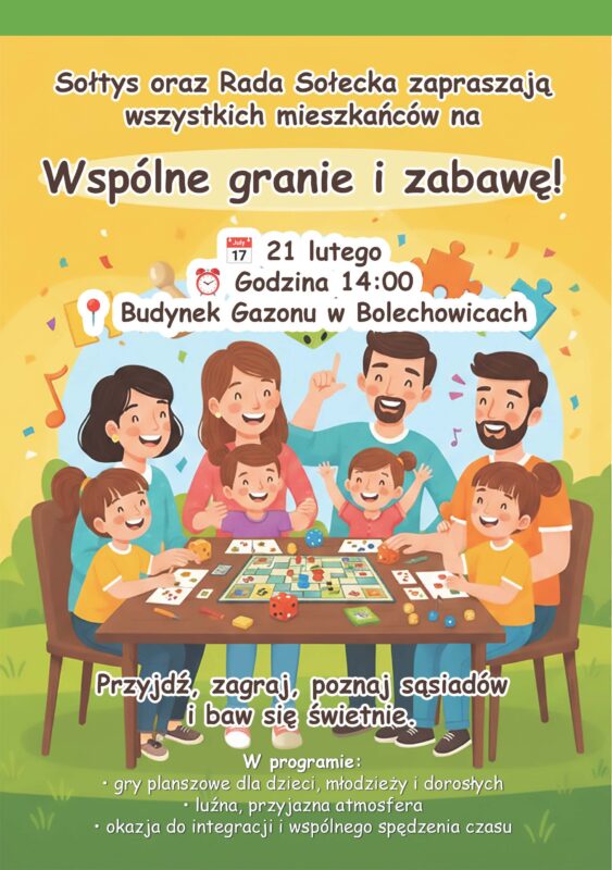 Sołtys oraz Rada Sołecka Bolechowic serdecznie zapraszają wszystkich mieszkańców — małych i dużych — na wspólne granie, dobrą zabawę i miłe spędzenie czasu.